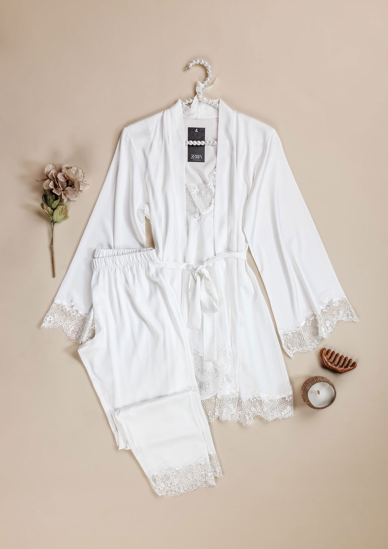 اشعري بالإثارة والراحة في آنٍ واحد مع طقم البيجامة المكون من ثلاث قطع. يتضمن الطقم رداءً بتفاصيل دانتيل، وقطعة ساتان مطاطية بلمسات دانتيل، وأشرطة قابلة للتعديل لمقاس مخصص. تألقي بإطلالة ساحرة طوال الليل.