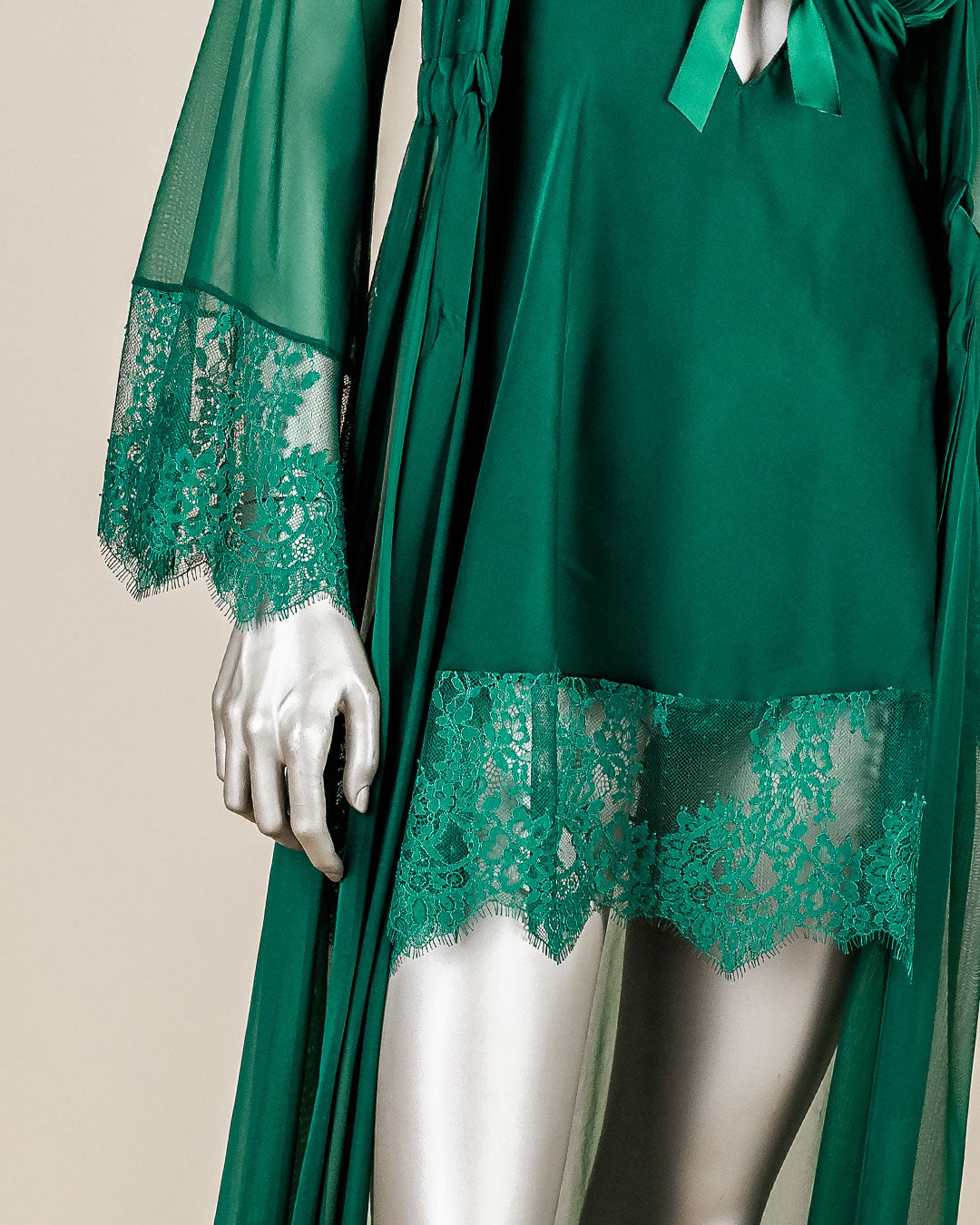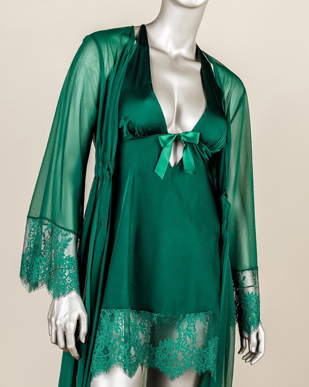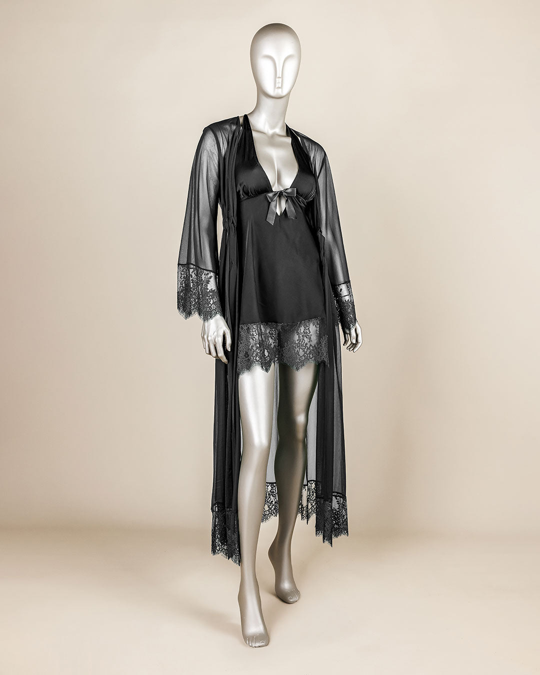 استمتعي بالراحة والدفء مع طقم قميص النوم الأنيق هذا. يتكون هذا الطقم من قطعتين: رداء شيفون طويل ورداء ساتان بلمسات من الدانتيل. هذا الطقم مثالي لجميع احتياجاتكِ المسائية. استمتعي بإطلالة فاخرة مع هذا الطقم الجميل.